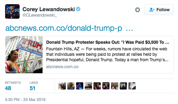 El periodista fantasma también escribió una historia acerca de que los votantes de Hillary Clinton eran pagados para que hicieran protestas contra el candidato republicano. Horner se atrevió a dar la cifra exacta de los honorarios de los manifestantes profesionales: 3.500 dólares a cada uno.Corey Lewandowski, jefe de campaña republicano, tuiteó esa "noticia". ¿Por qué lo hizo? "Porque sus seguidores tenían la creencia de que esas personas eran pagadas. Mirando hacia atrás, en lugar de dañar su campaña, creo que ayudó. Eso me hace sentir mal", señaló.