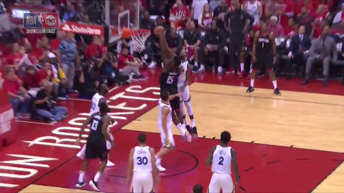 Houston dominaba el rebote de la mano de Clint Capela (20 puntos y 9 rebotes) y PJ Tucker (entre ambos sumaron 11 rebotes ofensivos capturados), y en ataque, Eric Gordon (23 puntos) y James Harden (32 puntos) se encargaban de atacar la zona para anotar, logrando 22 puntos en la pintura en los primeros 24 minutos. En los instantes finales de la primera mitad, Golden State reaccionó gracias a un anárquico Kevin Durant (34 puntos) y redujo la distancia en el luminoso al descanso, 54-43.
