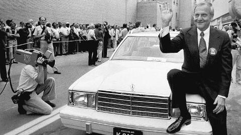 Lee Iacocca muestra el nuevo modelo de 'auto K' de la Chrysler, un Plymouth Reliant, en 1980.
