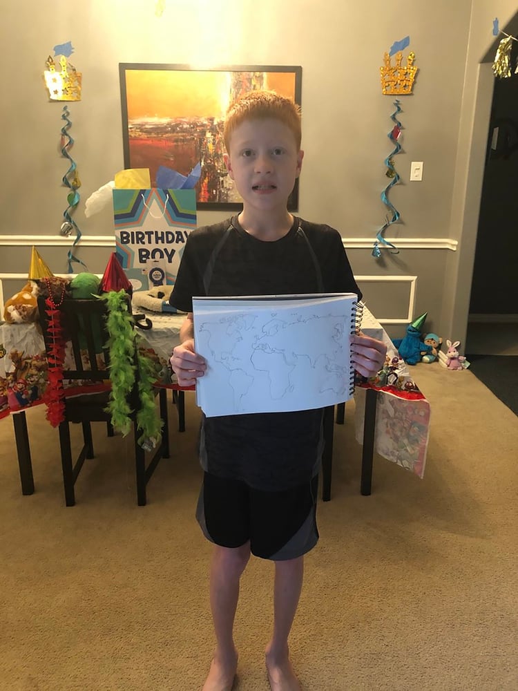 Entonces llegó el turno de Brandon de compartir su regalo: en una hoja en blanco trazó el mapamundi y marcó con puntos la ubicación de cada ciudad de la que recibió su saludo.
