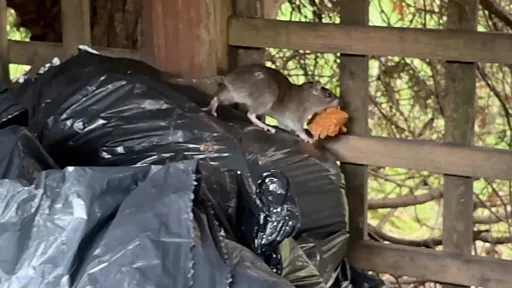 Momentos después, se oye un crujido y una rata sale disparada de debajo del camino de hormigón hacia los contenedores comunes. A continuación, la cabeza de una rata grande emerge de una madriguera al fondo del jardín.